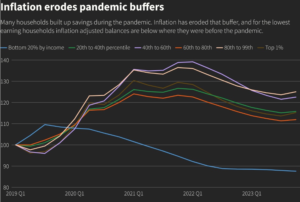 折扣连锁店TJX的亮眼业绩与面向高端市场的梅西百货疲弱业绩也是一个例子。TJX旗下经营着T.J. Maxx、Marshall’s、Sierra和HomeGoods,该公司已经成为折扣价领域事实上的领导者:它有能力提供各种高端品牌产品,并吸引那些在持续通货膨胀的情况下寻求更便宜选择的高收入购物者。去年,该公司多次上调销售和利润预期。相比之下,旗下拥有多个高端品牌商场的梅西百货公布的2024年盈利指引不及预期,还宣布拟关闭150家门店。