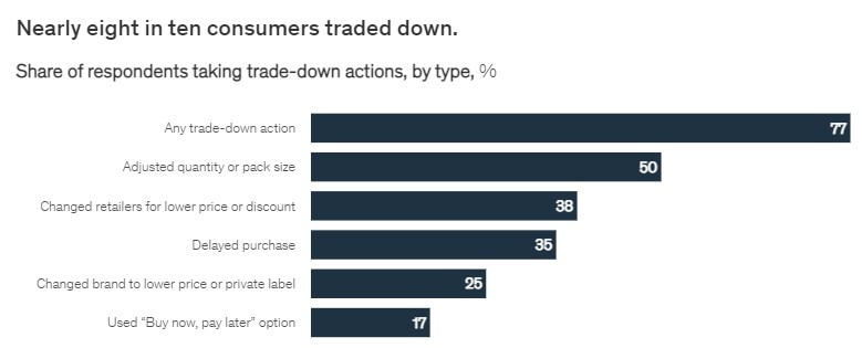 在四季度零售股财报中也可看出,消费者寻求“折价交易”,选择价格较低的替代品来购买他们想要的东西,或者等待折扣价格。沃尔玛高管们在电话会议上表示,低价的商品销量正在上升;这家零售商正在全店降价,包括一般商品和一些关键的杂货产品。数据证明了这一点:根据分析,去年感恩节周末期间,每笔订单的平均数量增长了10%,而平均订单金额仅增长了2%。麦肯锡的报告也指出,近八成美国人进行了消费降级。