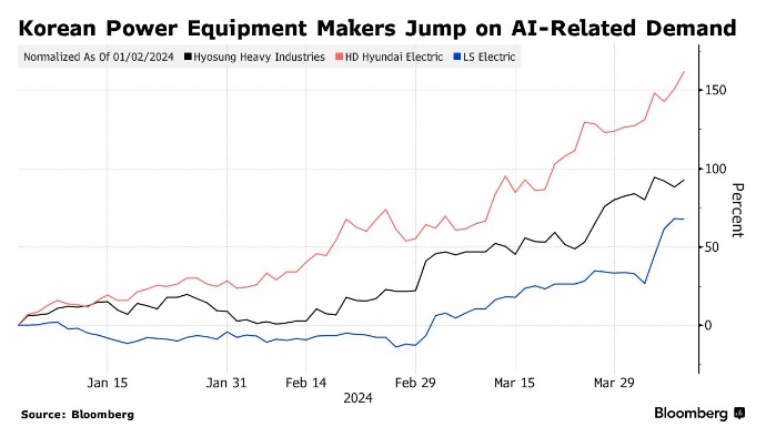 生产电力变压器、开关设备和发电机的HD Hyundai Electric Co.今年以来上涨了近160%,成为基准韩国KOSPI指数成分股中表现最好的公司。同期,晓星重工(Hyosung Heavy Industries Corp.)的股价几乎翻了一番,LS Electric Co.股价上涨近70%。