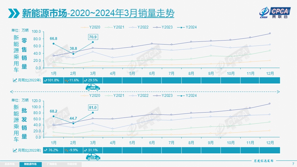 智通财经APP获悉,4月9日,乘联会发文称,3月1-31日,乘用车市场零售168.7万辆,同比增长6.0%,环比增长52.8%;1-3月累计零售482.9万辆,同比增长13.1%。2024年一季度车市零售基本实现预期中的开门红走势,3月同、环比均高增长的重要原因是春节因素带来的节后消费恢复。春节后的价格战迅速升温,随之形成明显消费观望现象,加之对部分新车的关注以及对以旧换新政策的预期,3月车市呈现慢热型启动。