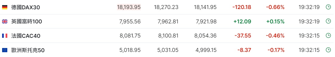 2. 截至发稿,德国DAX指数跌0.66%,英国富时100指数涨0.15%,法国CAC40指数跌0.46%,欧洲斯托克50指数跌0.17%。
