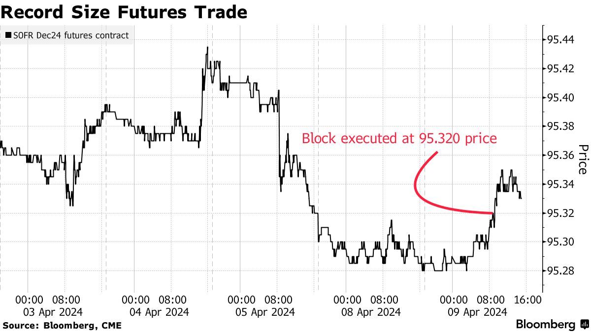 SOFR期货于2018年5月推出,已成为对美联储设定的利率进行押注的主要工具。大宗交易是私下协商的、单一价格的、满足最低规模门槛的交易。期货价格随后上涨,暗示交易是由买方发起的,美债收益率则进一步跌向日低。