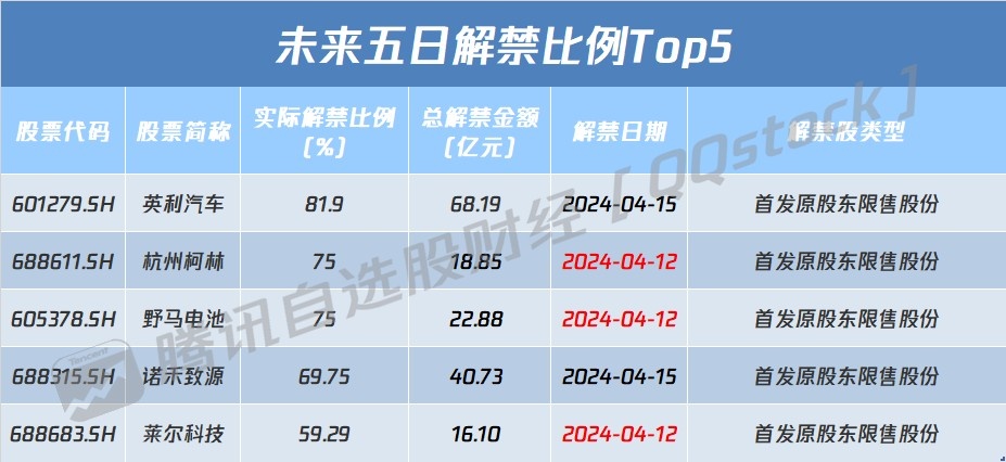 从解禁比例来看,未来五日英利汽车实际解禁比例达81.9%,其次解禁比例居前的分别为杭州柯林和野马电池。