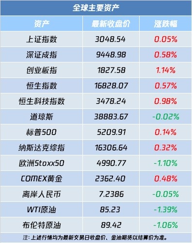 自选哥提示,隔夜美股三大指数涨跌不一,道指跌0.02%;人民币资产集体上扬,中概指数涨1.68%,离岸人民币继续小幅升值;COMEX 6月黄金期货收涨0.48%,报2362.4美元/盎司;WTI 5月原油期货收跌1.39%,报85.23美元/桶。
