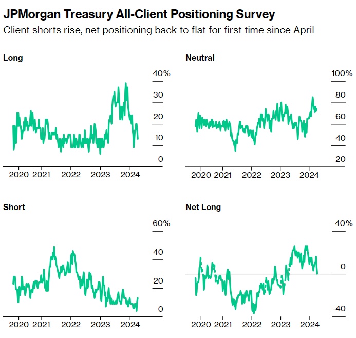 摩根大通对美国国债客户的最新调查显示,空头头寸上升2个百分点,令其客户的净头寸自2023年4月17日以来首次为中性。以直接仓位计,空头仓位仍为年初以来最大,而直接多头仓位则为2月以来最低。