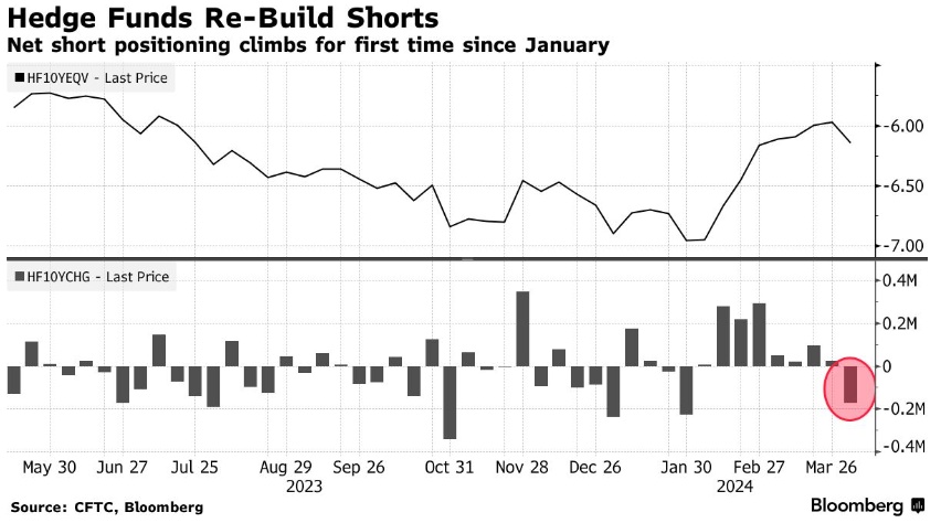 智通财经获悉,美国商品期货交易委员会(CFTC)的每周数据显示,在近期美国国债收益率上升之际,利用借来资金放大回报的杠杆基金两个月来首次增加了美国国债期货市场的空头头寸。投资者也加大了对现货市场的看跌押注,摩根大通最新的客户调查显示,截至4月8日,空头头寸增加,使客户的净头寸变为中性,而非净多头头寸,这是近一年来的首次。