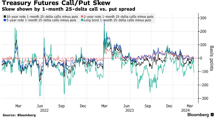 为对冲公债抛售而支付的溢价仍居高不下,在本周所有期限公债收益率均上升的情况下,长期公债期货的所谓看跌/买入偏态溢价最高。本周期权市场的流动反映了这种看跌情绪,包括周一出现的一系列以5年期和10年期美国国债收益率突破5%为目标的交易。