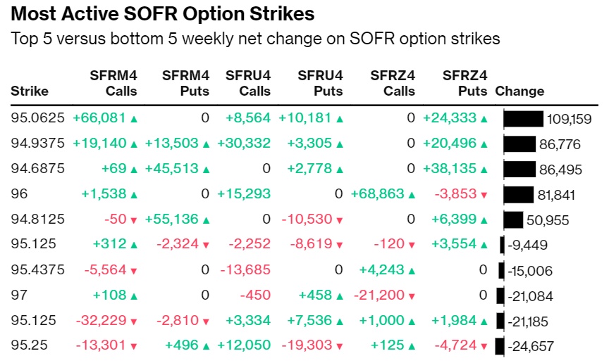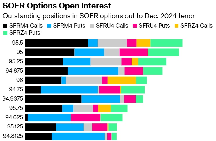 过去一周最活跃的SOFR期权执行是95.0625和94.9375,上周的活动包括买入6月24日94.9375/95.0625/95.1875的看涨期权和9月24日94.9375/95.0625/95.1875的看涨期权。在6月24日的94.875/94.9375/95.00/95.0625看涨区间也有大量买盘。