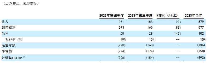 4月8日,路特斯发布了2023年第四季度和全年未经审计的财务报告。公告显示,2023年第四季度路特斯实现收入3.61亿美元,较上一季度环比增加了92%;毛利6843.3万美元,对应毛利率19%。全年来看,公司的总营收达到了6.79亿美元,全年毛利率增至15%。
