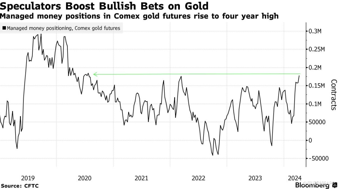 但投资者并没有被吓倒。在纽约商品交易所黄金期货市场,基金经理们正在加大对黄金的看涨押注,截至4月2日当周的净多头头寸升至近四年高位。