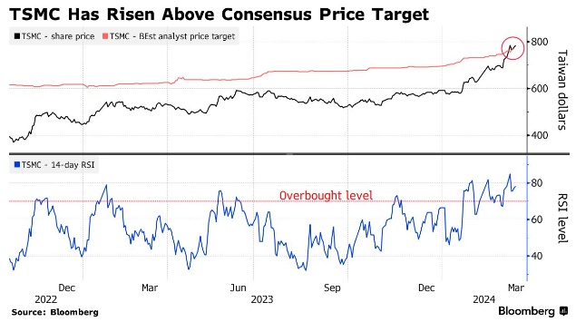 自2022年10月的低谷以来,台积电的市值已增长了一倍以上,因为投资者押注该公司为英伟达等公司生产的先进人工智能芯片将持续受到需求的影响。这抵消了市场对全球智能手机衰退是否已经结束的担忧。该公司定于4月18日公布完整业绩。