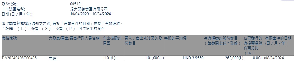 智通财经APP获悉,香港联交所最新资料显示,4月8日,远大医药(00512)获执行董事、行政总裁周超增持10.10万股,每股作价3.9550港元,总金额为39.9455万港元。增持后最新持股数目26.30万股。