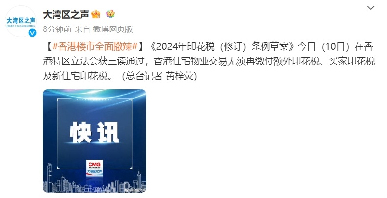 智通财经APP获悉,据“大湾区之声”微博10日消息,《2024年印花税(修订)条例草案》在香港特区立法会获三读通过,香港住宅物业交易无须再缴付额外印花税、买家印花税及新住宅印花税。
