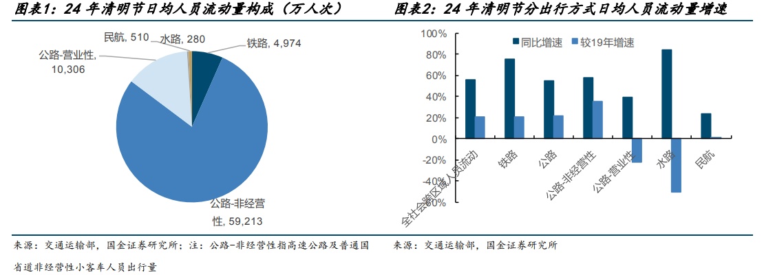 据交通部数据,2024年清明假期全社会跨区域人员流动量7.5亿人次,日均2.5亿人次,较23年同期日均增长56.1%,较19年同期日均增长20.9%。根据出行方式来看,铁路、公路、水路、民航分别发送旅客4974、69519、280、510万人次,分别同比增长75%、55%、85%、24%,同比19年增长21%、22%、-50%、2%。