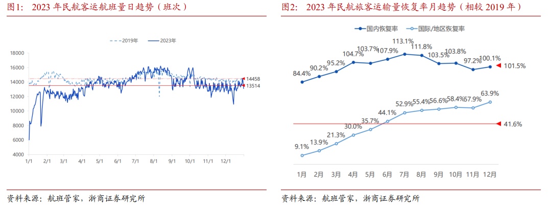 运力端:2023年国内线已经超过2019年,国际线至年底已经恢复超6成。具体而言,据航班管家数据披露,2023年客运航班日均13514班次,同比19年下降6.5%,虽然还没恢复至疫情水平,但已逐渐拉小差距。分航线来看,国内线、国际及地区线同比2019年分别+5.2%、-59.1%。