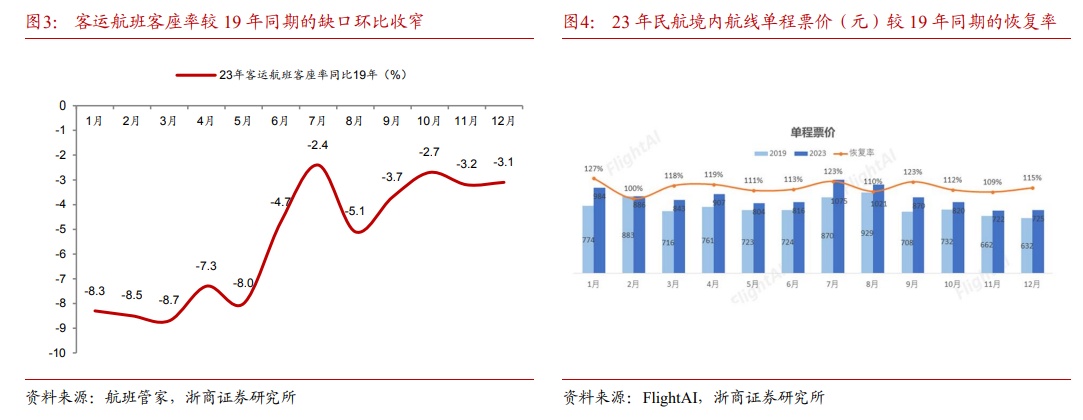 客座率:作为航空公司经营情况的另一个重要指标,缺口也持续收窄。根据航班管家,2023年客运航班客座率约77.9%,较2019年下降5个百分点左右,但客座率缺口逐季收窄,持续向好。