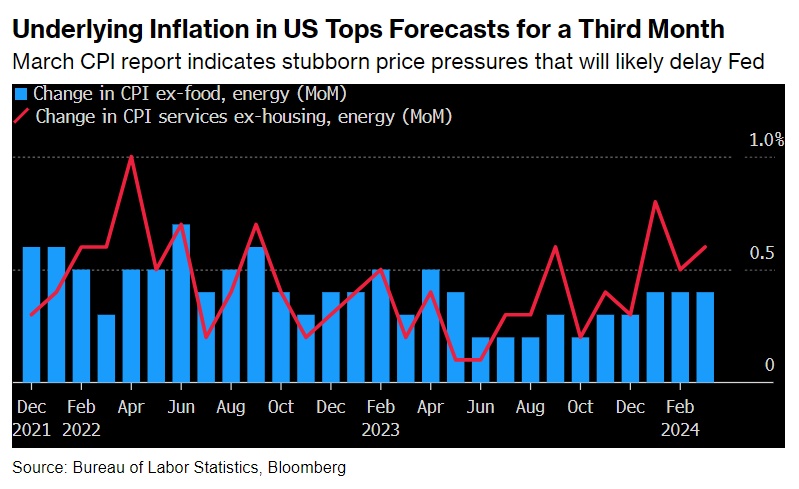 周三的消费者价格数据报告进一步证明通胀粘性持续存在,尽管美联储坚持将基准利率维持在20年来的最高位,但是美联储抗击通胀的进展可能正在出现停滞现象。