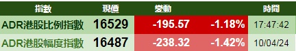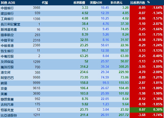 智通财经APP获悉,周三美股三大指数全线下跌,港股ADR指数下跌,按比例计算,收报16529点,较香港收市下跌195.57点或1.18%。