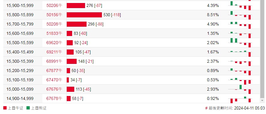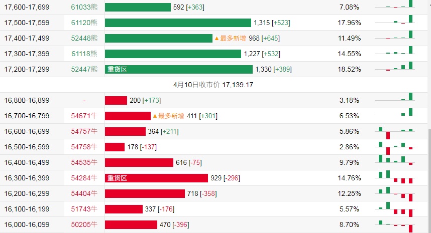 牛证街货重货区在16300-16399区间,该区间最新牛证数量为929张,较上一交易日减少296张;最多新增在16700-16799区间,该区间最新牛证数量为411张,较上一交易日增加301张。