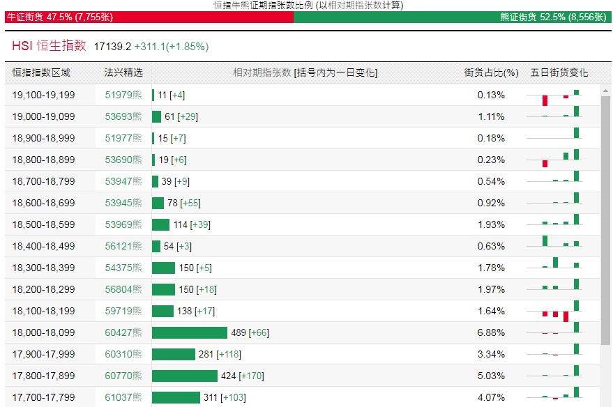 法兴恒指牛熊证街货分布图中的数据显示,熊证街货重货区在17200-17299区间,该区间最新熊证数量为1330张,较上一交易日增加389张;最多新增在17400-17499区间,该区间最新熊证数量为968张,较上一交易日增加645张。
