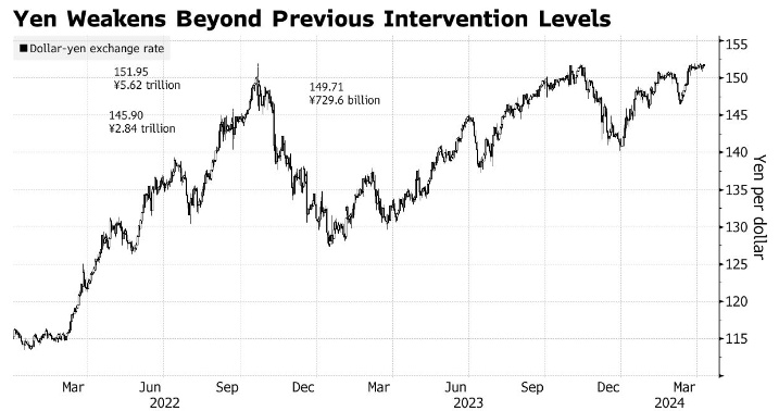 在日本央行3月份结束负利率政策后,日元最近面临新的下行压力,但没有就进一步加息提供指导,也没有发出将保持宽松金融环境的信号。日本当局在2022年花了9.2万亿日元(约合600亿美元)三次支撑日元。现在的日元比1998年以来首次干预货币市场时要弱得多。
