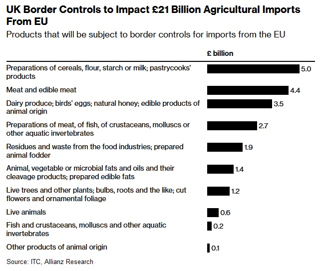 智通财经APP获悉,Allianz Research发布的一份报告显示,英国脱欧后对从欧盟进口到英国的某些食品实施的边境管制措施可能会将通胀率推高0.2个百分点。Allianz Research预计,这种影响可能会持续几个月,也可能会持续更长时间;乳制品、肉类和鱼类产品将是受边境管制影响最大的产品——英国消费的肉类80%以上来自欧盟、消费的乳制品95%来自欧盟。