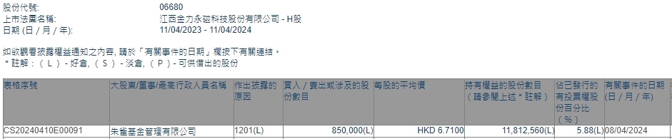 智通财经APP获悉,香港联交所最新资料显示,4月8日,朱雀基金减持金力永磁(06680)85万股,每股作价6.71港元,总金额为570.35万港元。减持后最新持股数目约为1181.26万股,最新持股比例为5.88%。