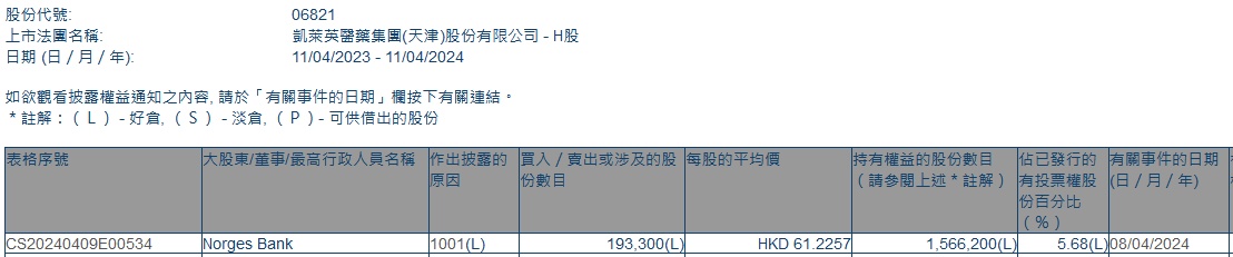 智通财经APP获悉,香港联交所最新资料显示,4月8日,Norges Bank增持凯莱英(06821)19.33万股,每股作价61.2257港元,总金额约1183.49万港元。增持后最新持股数目为156.62万股,最新持股比例为5.68%。