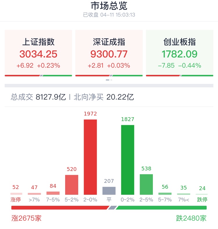 4月11日,融券传闻扰动,沪指弱势反弹。盘面上,工程机械板块大涨,Sora、传媒等AI赛道反弹,旅游、汽车、核污染防治、顺周期等板块涨幅居前;下跌方面,同花顺、智飞生物等创业板权重盘中跳水,低空经济、养殖、军工、医药等板块跌幅居前。