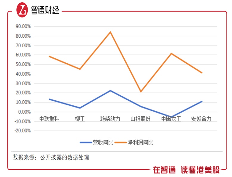 具体来看,潍柴动力、中联重科及安徽合力收入增幅均为两位数,分别为13.08%、22.15%及10.76%;柳工及山推股份收入增幅仅为个位数,分别为3.93%与5.43%,基本与去年持平;中国龙工营收甚至出现下降态势,同比下降5.63%。值得关注的是,业务规模较大中联重科及潍柴动力营收韧性较强。