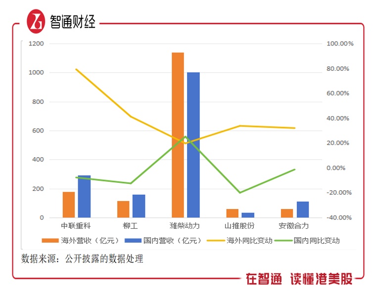 中联重科海外营收同比高增79.20%至179.05亿元;柳工、山推股份、安徽合力海外营收分别为114.62亿元、58.78亿元及61.13亿元,同比分别增长41.18%、33.73%及31.97%;潍柴动力增幅弱于同行,达19.67%。