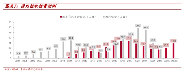 中泰证券预计2024年挖机自然更新周期需求进入上行周期,预计2023年至2025年自然更新需求为8.6万台、10.3万台及14.6万台。