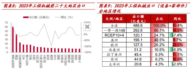 海外市场来看,根据工程机械工业协会最新数据,2023年,中国工程机械进出口贸易额合计约为510.63亿美元,同比增长8.57%。其中,累计出口金额为485.52亿美元,同比增长9.59%。至此,中国工程机械出口金额保持了连续三年的高速增长态势。分区域看,2023年,“一带一路”沿线国家成为工程机械重要出口地。数据显示,2023年,中国对“一带一路”沿线国家出口金额合计约为99.19亿美元,同比增长53.3%。