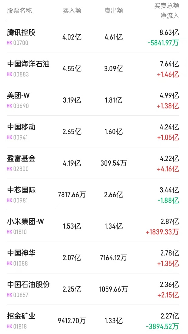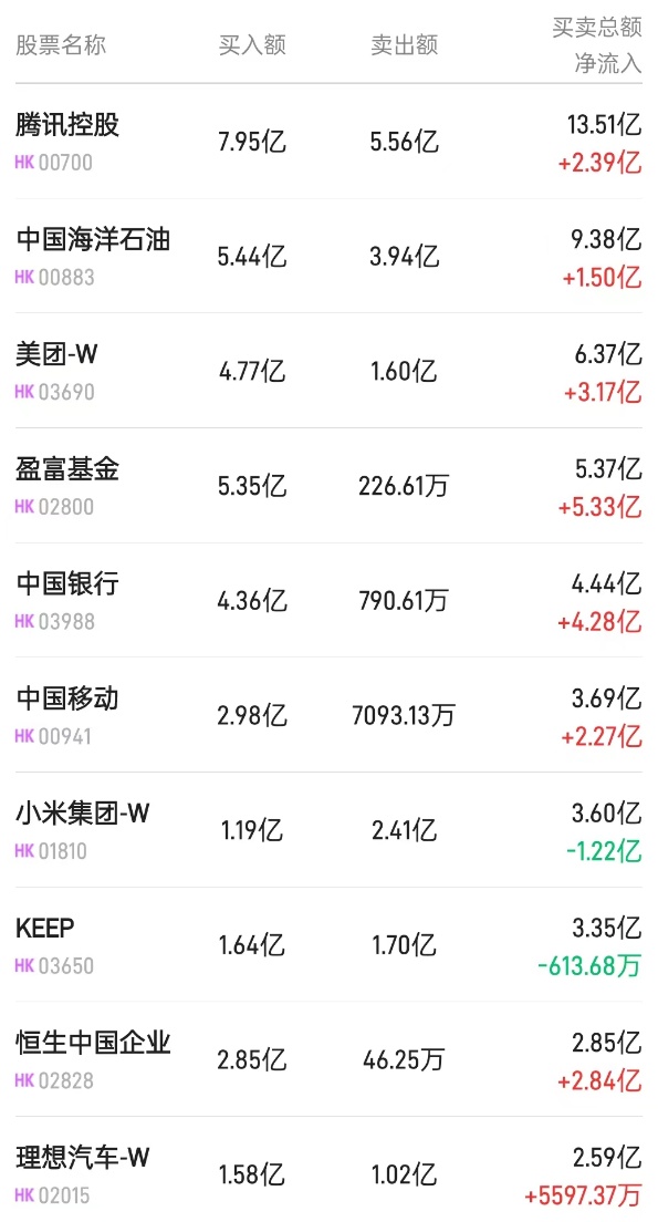 此外,中国移动(00941)、腾讯(00700)、理想汽车-W(02015)分别获净买入3.32亿、1.8亿、5597万港元。而中芯国际(00981)遭净卖出1.88亿港元。
