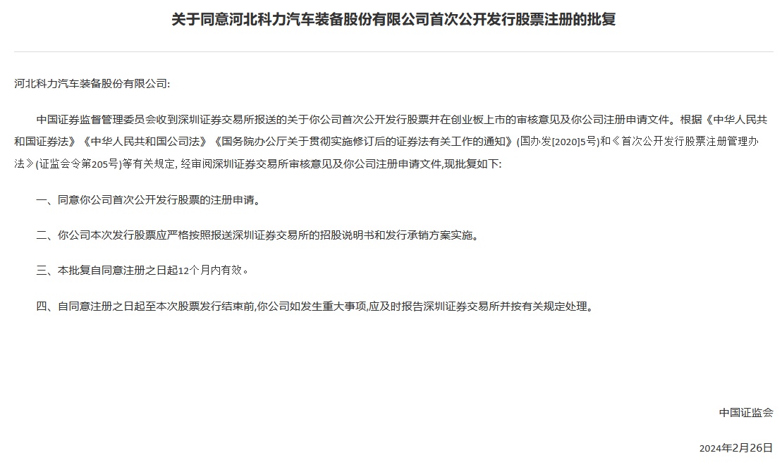 智通财经APP获悉,4月11日,中国证监会发布《关于同意河北科力汽车装备股份有限公司首次公开发行股票注册的批复》。据悉,科力股份拟在深交所创业板上市,IPO保荐机构为长江证券,拟募资3.4084亿元。