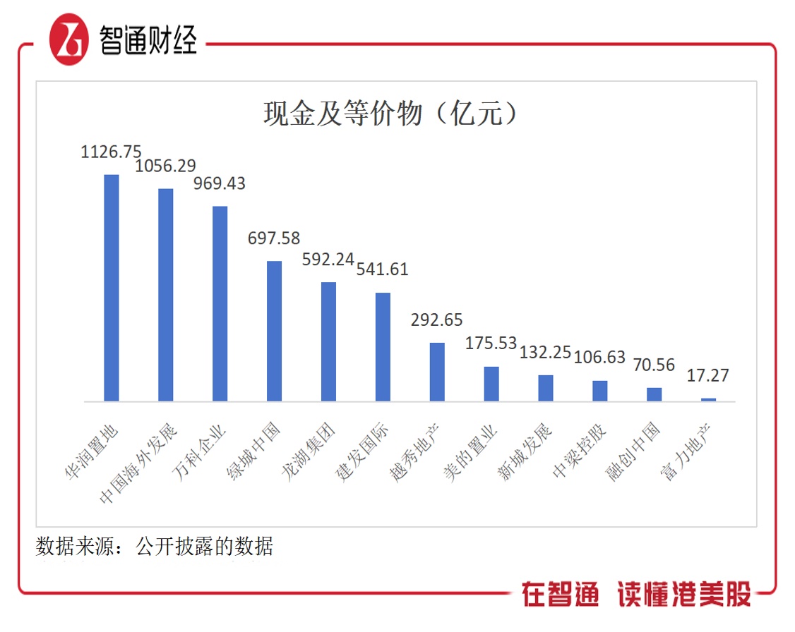 “账上有粮”才有保障,2023年经统计的内房股中,华润置地现金等价物最多,为1126.75亿元,其次后四名分别为中国海外发展、万科、绿城及龙湖,现金等价物分别为1056.29亿元、969.43亿元、697.58亿元及592.24亿元。值得注意的是,融创中国及富力地产现金分别为70.56亿元及17.27亿元,另外恒大于上半年现金有40.47亿元,均低于百亿元,抗负债风险能力较弱。