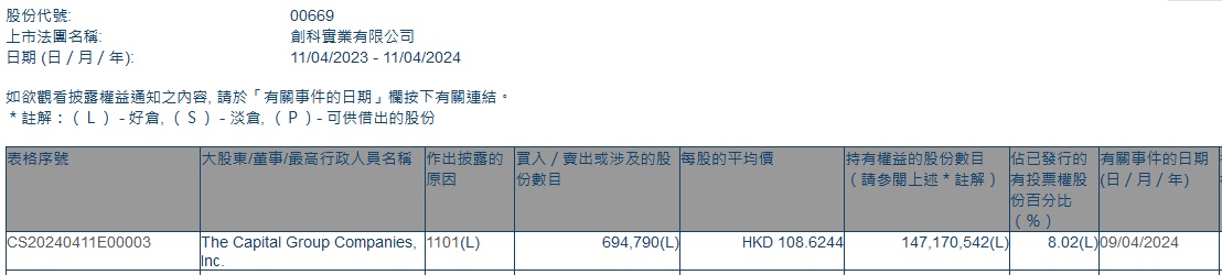 智通财经APP获悉,香港联交所最新资料显示,4月9日,美国资本集团增持创科实业(00669)69.4790万股,每股作价108.6244港元,总金额约为7547.11万港元。增持后最新持股数目约为1.47亿股,最新持股比例为8.02%。