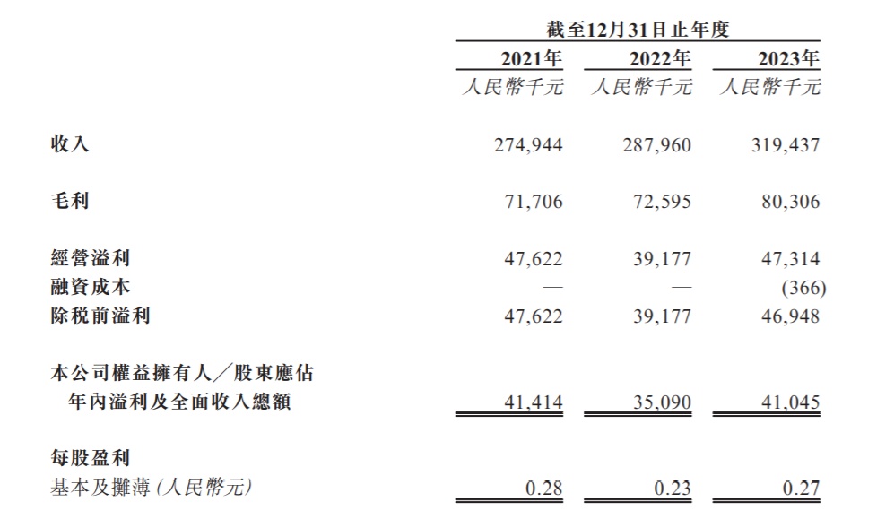 财务方面,于2021年、2022年、2023年,公司实现收入分别为2.75亿元、2.88亿元、3.19亿元,同期,公司年内溢利及全面收入总额为4141.4万元、3509万元、4104.5万元。