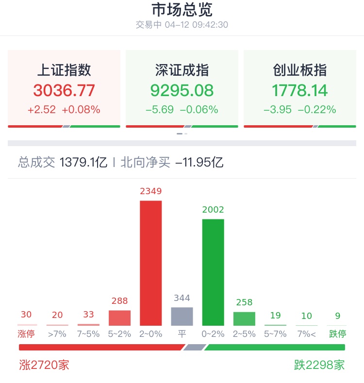 4月12日,A股早盘走势分化,盘面上,贵金属等周期股延续热度,家电、汽车拆解、算力、消费电子等板块涨幅居前;下跌方面,固态电池等新能源赛道股走低,旅游、核污染防治等板块跌幅居前。