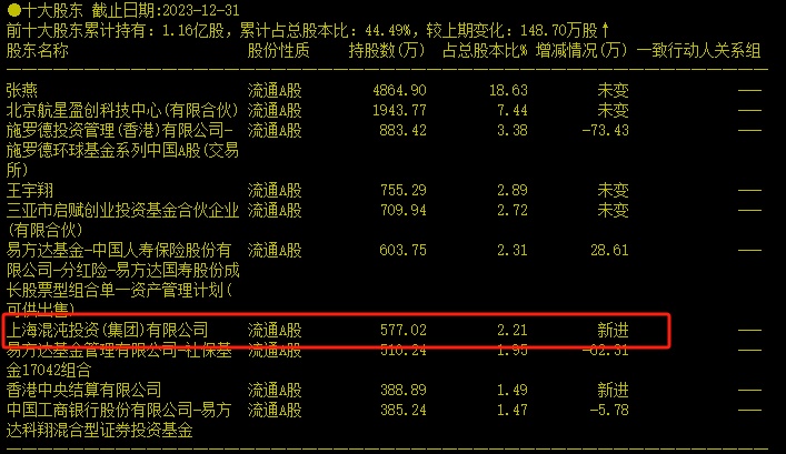 智通财经APP获悉,4月11日,航天宏图(688066.SH)发布2023年年报,最新股东名单显示,葛卫东旗下的混沌投资现身前十大股东名单,新进超577万股,为第七大股东,持股占总股本2.21%。