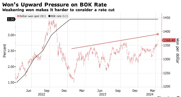 韩元是今年亚洲表现最差的货币之一,下跌了5.9%。由于对美联储降息的预期已被推迟,韩国央行将难以启动宽松周期,因为这将进一步给韩元带来压力,并可能通过进口刺激成本推升型通胀。在3月份美国物价上涨快于预期之后,投资者已将美联储2024年降息的预期下调至两次,第一次降息预计要到9月份。