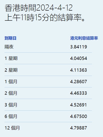 智通财经APP获悉,4月12日,港元拆息全线向下,其中,隔夜息微降至3.84119%,为近一个月新低。与楼按相关的一个月拆息连跌10日,今报4.28607%,为9月7日以来最低。