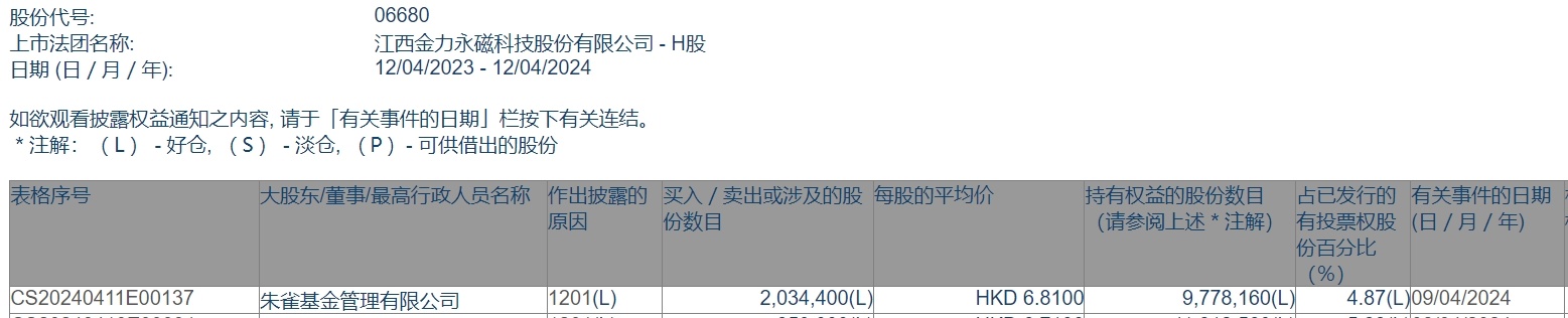 智通财经APP获悉,香港联交所最新资料显示,4月9日,朱雀基金减持金力永磁(06680)203.44万股,每股作价6.81港元,总金额约为1385.43万港元。减持后最新持股数目约为977.82万股,最新持股比例为4.87%。