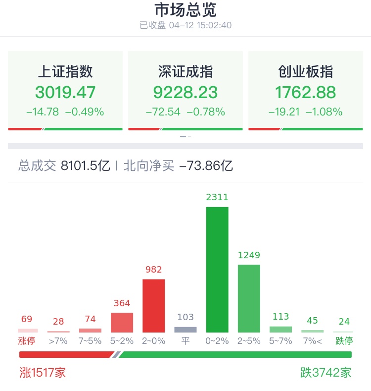 4月12日,A股震荡调整,尾盘跳水,北向资金净卖出超70亿元。盘面上,新能源赛道股领跌,大金融板块全线走低,飞行汽车、核污染防治、传媒、白酒等板块跌幅居前;上涨方面,家电等设备更新概念股逆势走强,贵金属板块强势,油气、光模块、旅游等板块涨幅居前。
