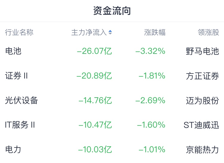 主力资金方面,资金出逃电池、证券、光伏、电力等行业,净流出电池行业超25亿;资金小幅净流入通信设备、工业金属、贵金属、半导体等行业。