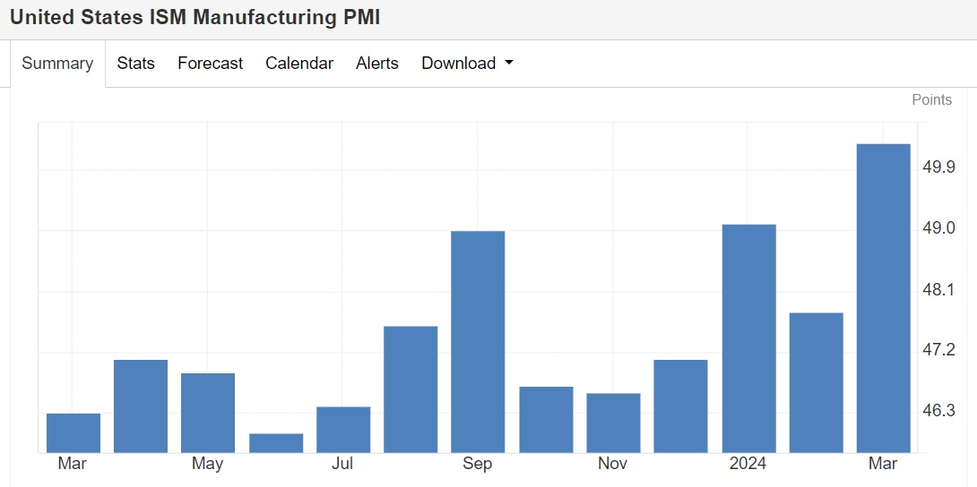 最新的统计数据显示,美国3月ISM制造业PMI为50.3,远超经济学家们普遍预期的48.4,以及47.8这一前值,这一数据标志着美国制造业在经历长达16 个月的收缩后首次超过50这一关键荣枯线点位,意味着美国制造业扩张之势。中国3月制造业PMI较2月回升1.7个百分点至50.8,为2023年9月以来首次回到50荣枯线以上。