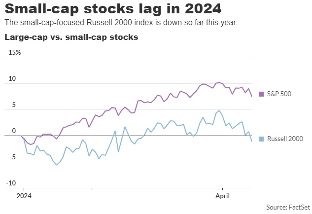 今年到目前为止,罗素2000指数下跌了0.9%,远远落后于广受关注的标普500指数。截至周五,标普500指数在2024年已经上涨了7.4%。