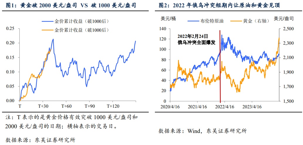 历史总是充满韵脚,黄金短期内的上涨可能要进入冲刺阶段了。如果参考2009年,黄金突破1000美元/盎司后,在上涨至20%~25%区间时遭受明显阻力,其后经过近5个月的调整才再创新高;如果回到2022年,黄金在俄乌冲突爆发后两周内见顶(图1和2)。而当前在“央行买金说”和伊朗以色列冲突的风险下,金价短期内的顶部或将出现,预计能够短暂站上2500美元/盎司。