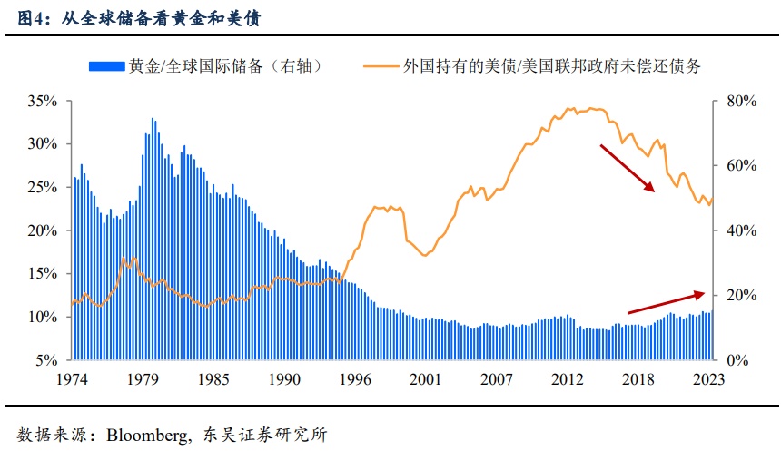 至于国内黄金相较海外的溢价和超额需求,可能会长期存在。从2022年以来,国内金价年度涨幅连续高于海外,我们认为两点结构性因素会可能使得溢价长期存在:一是在内外利差倒挂的情况下,黄金是一种相对低成本的对冲和防范人民币汇率风险的工具(当然只能部分对冲);二是在当前国内资产收益率下降、安全资产稀缺以及对外投资受限的背景下,黄金提供了一定的避风港以及参与全球配置的渠道,我们认为国内资产配置中黄金的占比应该会结构性高于全球平均水平。