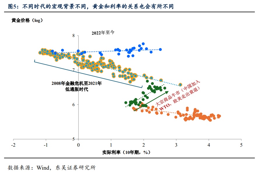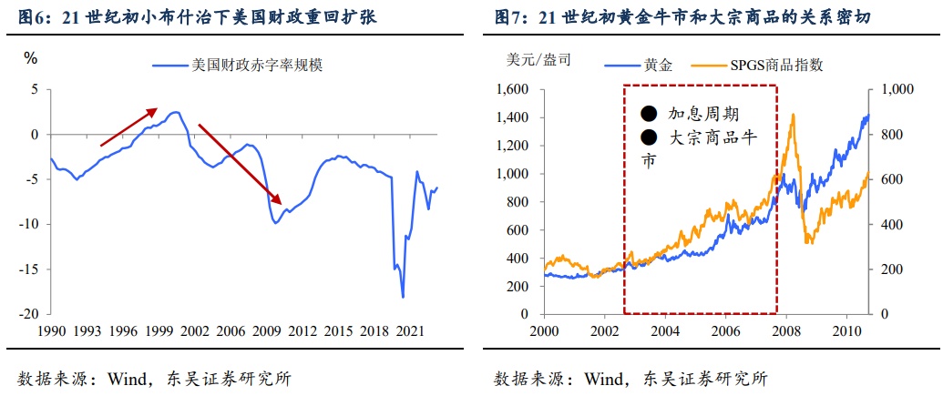 此外,历史上也出现过金价和实际美债收益率正相关的情况,关键词“债务”和“通胀”。如图5所示,21世纪初至金融危机前曾出现过金价和美债的正相关,背后的原因一方面是小布什入主白宫,财政政策从克林顿治下的偏紧重回迅速扩张,另一方面则是中国加入WTO、美国地产周期向上以及欧盟不断扩张下大宗商品的牛市。